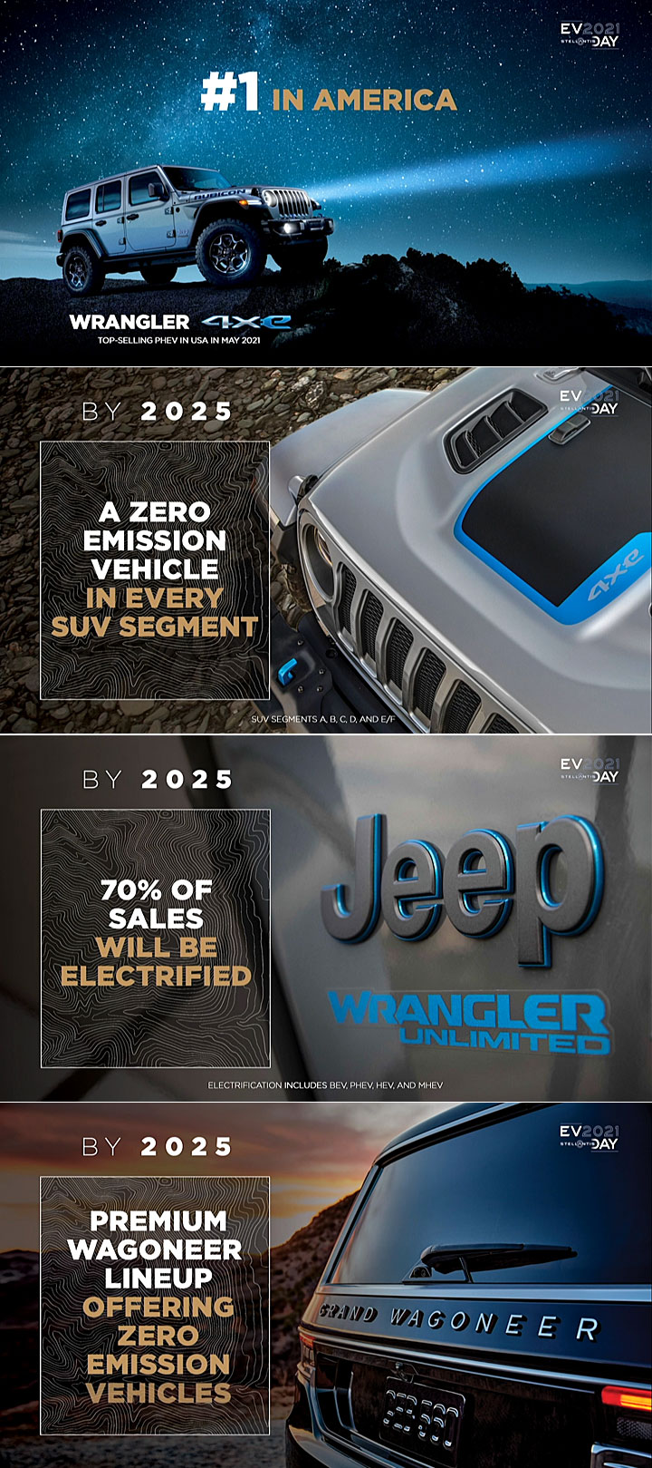 Jeep Wrangler 4Xe 在美国市场也成为最畅销的 Plug-in Hybrid 插电式油电混合车款,Jeep 期望在 2025 年于旗下每一个 SUV 级距都推出零排污车款,并在 2025 年让「电气化车款」佔其销量的 70%,2025 年也会针对其旗舰产品 Grand Wagoneer 推出零排污的纯电车型。