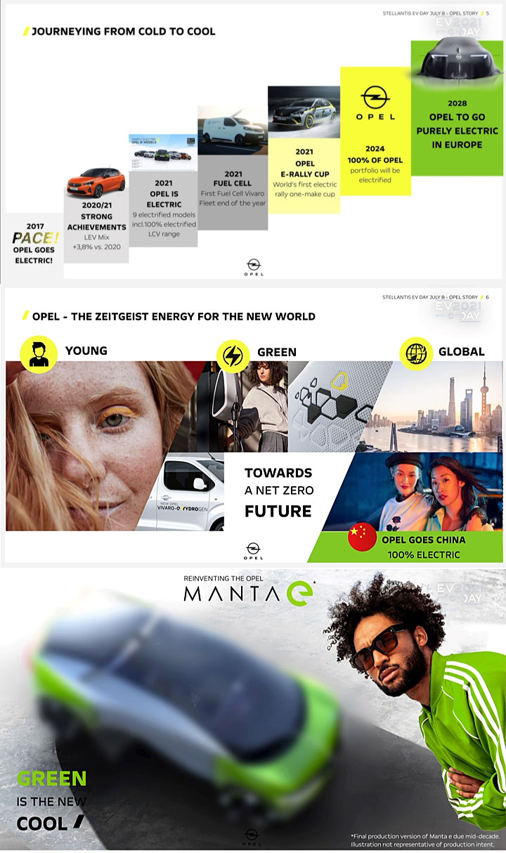 在 2024 年 Opel 将会达成全车系电气化的远景,并目标在 2028 年于欧洲转型为纯电品牌;甚至 Opel 宣示将重返中国市场、在当地全数仅贩售纯电车款。活动中预告在 2025 年左右会推出名为 Opel Manta e 的纯电新车。