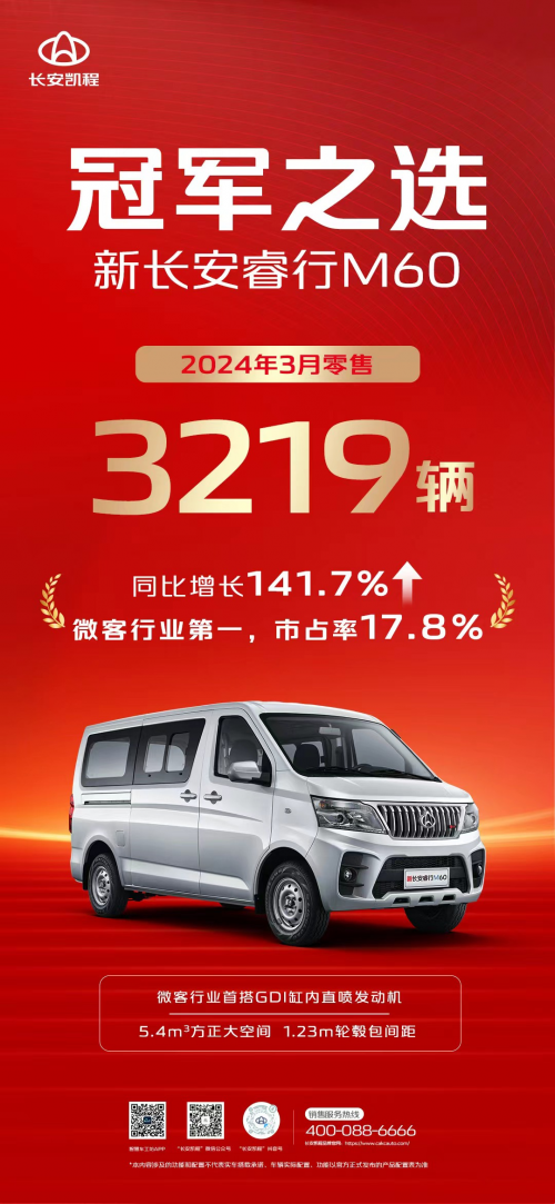 新长安睿行M60凭借着强动力、大空间、舒适内饰等卓越的产品实力,在微客市场一直一直备受好评,荣登2023年微客细分市场销量第一。在微客市场竞争日益激烈的背景下,新长安睿行M60在2024年3月零售3219辆,同比增长141.7%,市占率达17.8%,坐稳了“冠军大微客”宝座,以实实在在的成绩擦亮“冠军之选”底色。