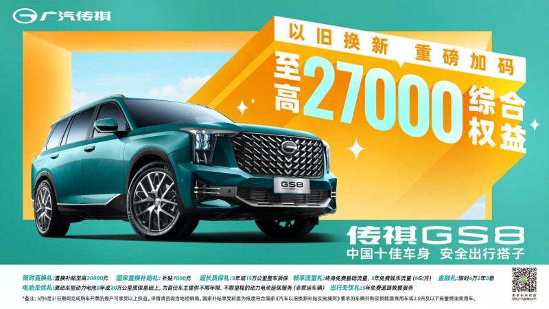 可以说,在中大型SUV市场,传祺GS8一直是一位稳健的全能选手,出众的产品表现也获得了不错的市场反馈。5月,国家以旧换新补贴正在进行,传祺在此基础上,政策加码,钜惠至高至27000元,为消费者带来了前所未有的购车福利。在亲自感受过它的卓越魅力之后,相信传祺GS8也会成为你购车的不二之选。