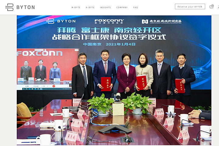 2021 年 1 月 Byton 拜腾汽车宣布,与国内鸿海集团所成立的 MIH 电动车联盟、南京经济技术开发区共同签署战略合作框架协定,原订于 2022 年第一季正式量产 Byton 品牌首款电动量产新车 M-Byte。