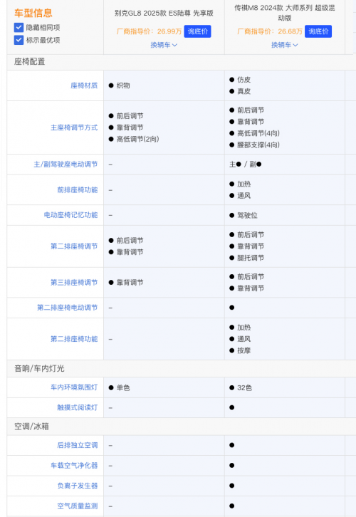 至于低配烟雾弹,更是合资品牌常用的套路。低价吸引消费者进店,却在实际购车过程中推荐更高配置的车型。而实际上,这些为了拉低价格的低配也是真正意义上的“乞丐版”车型,就拿新款GL8的最低配车型来说,绒布座椅、座椅手动调节、无座椅通风/加热、无双层玻璃等等,你很难说这是2024年一款卖到26.99万的车型该有的样子。