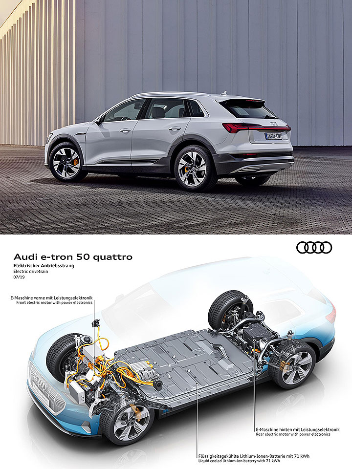 以现行的 e-tron 与 e-tron Sportback,有 55 quattro 和 50 quattro 车型,分别搭载 95 kWh 和 71 kWh 的电池,其中 e-tron 55 quattro 和 50 quattro 的续航里程为 436 公里与 336 公里、e-tron Sportback 55 quattro 和 50 quattro 的续航里程为 446 公里与 347 公里。