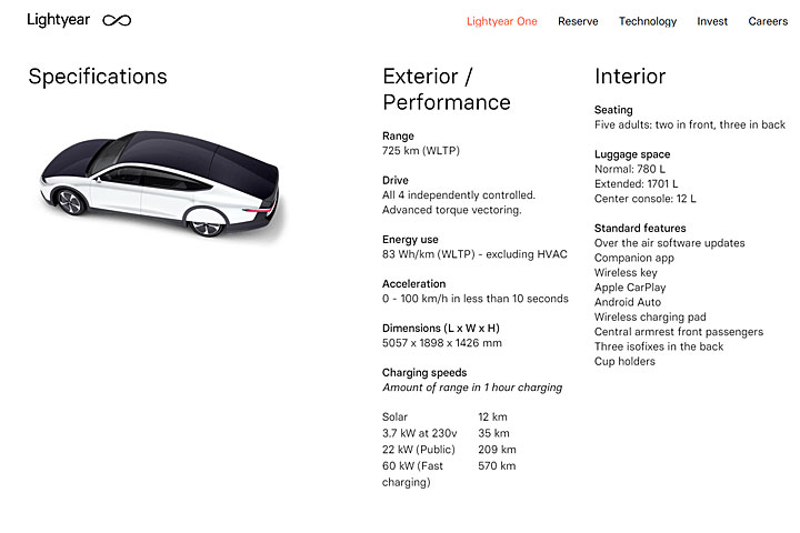 Lightyear One 动力系统配置 4 具轮内马达,搭配的锂电池组容量为 60kWh,静止加速至时速 100 公里约在 10 秒内完成,WLTP 续航里程为 725 公里。图为 Lightyear One 数据规格。